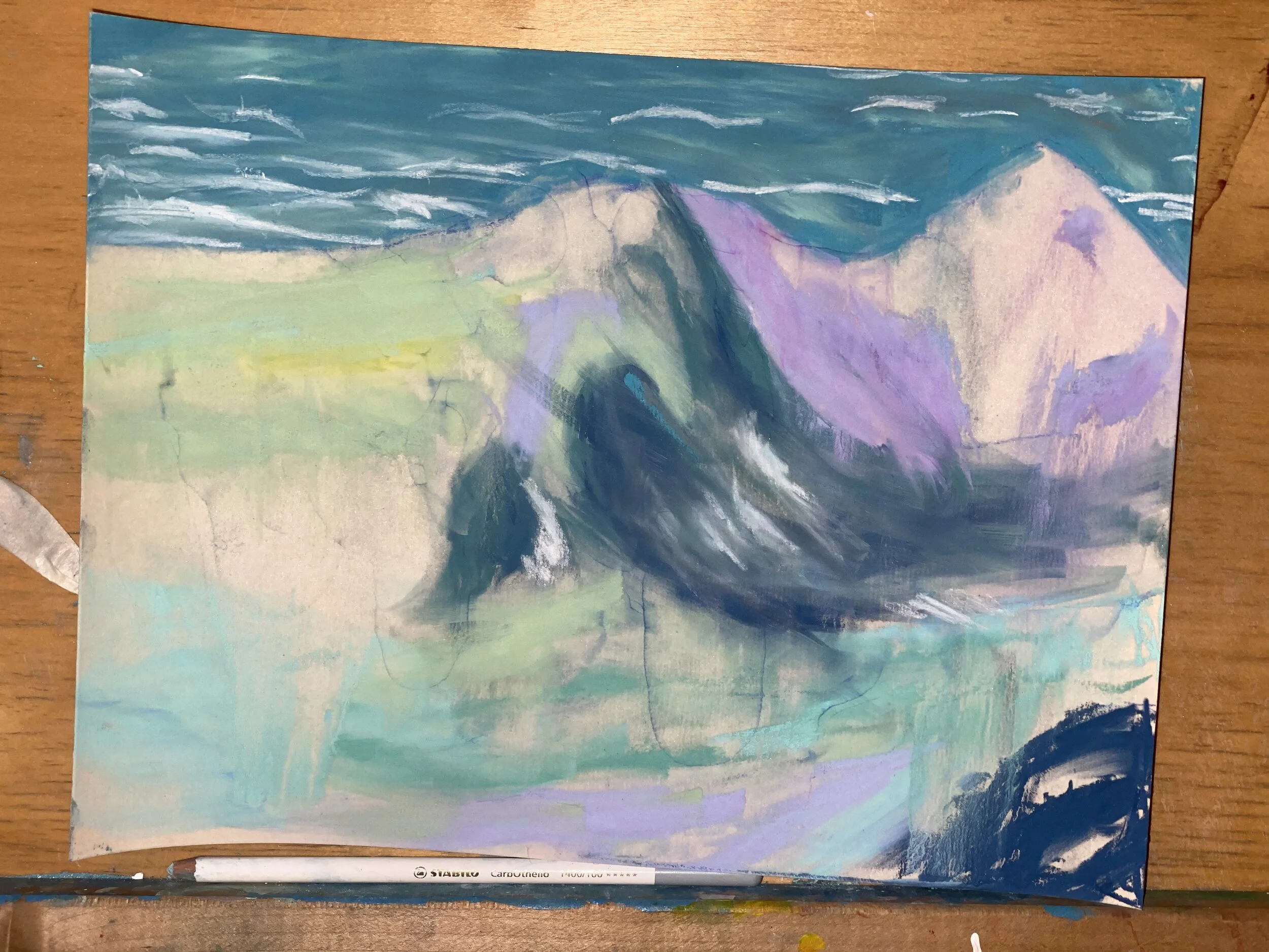We began on a new wave and was able to have a bit more confidence in the underpainting. This is when you do base paints of dark and lights in the colors that appear in the wave or background. We brushed on alcohol and saw how Cathy choose and laid the colors down for this first layer. She is teaching us how to build the wave from this point.